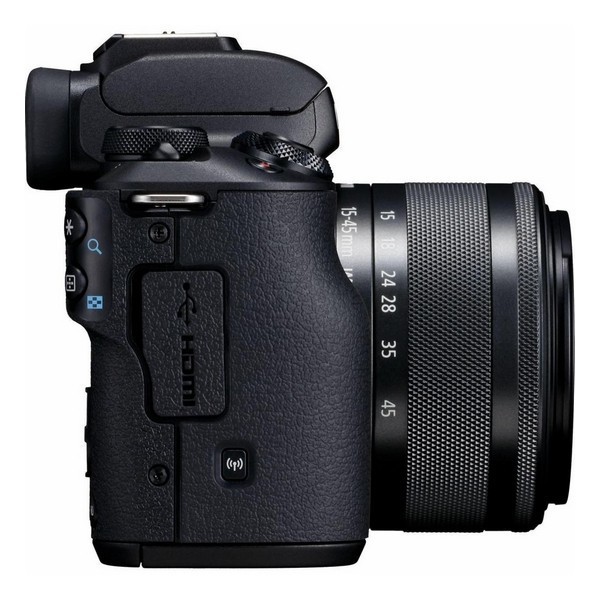 Корпус Canon M50Благодаря сенсорному экрану Canon EOS M50 с изменяемым углом наклона легко снимать под любым углом и даже делать селфи. Также у него есть встроенный электронный видоискатель для обычных снимков. Он имеет возможность сменных объективов. Стандартный объектив для камеры — 15–45 мм f/3,5 6,3.