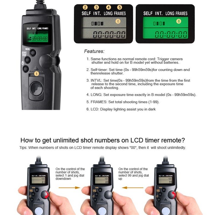 Его основная функциональность основана на интервальном таймере, переключателе затвора, дистанционном таймере и таймере установки. Его энергосберегающий дизайн означает, что он имеет отличное время автономной работы, а также возможность помогать вам делать фотографии в основных режимах: длительная выдержка, непрерывная съемка и съемка в движении.