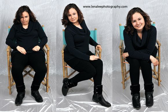 Если говорить об освещении, то в данном случае как раз следует избегать съемки в высоком ключе, ровного рассеянного света и белого фона. Попробуйте съемку в низком ключе, используйте темный фон и боковое освещение, которое скроет часть фигуры так, что она будет выглядеть стройнее.