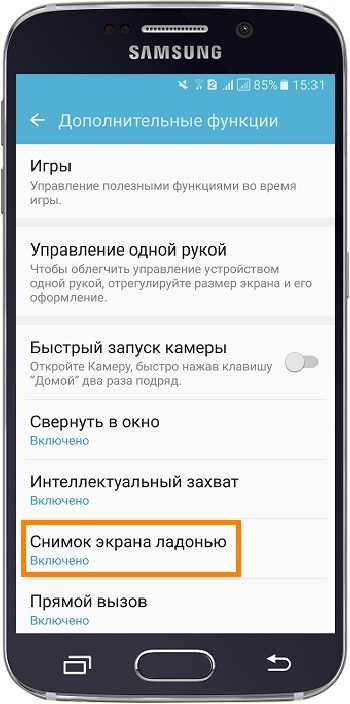 В самых современных телефонах Самсунг снимок экрана делается жестами. По умолчанию функция неактивна. Активировать ее можно в настройках управления, разделе «Управление ладонью».