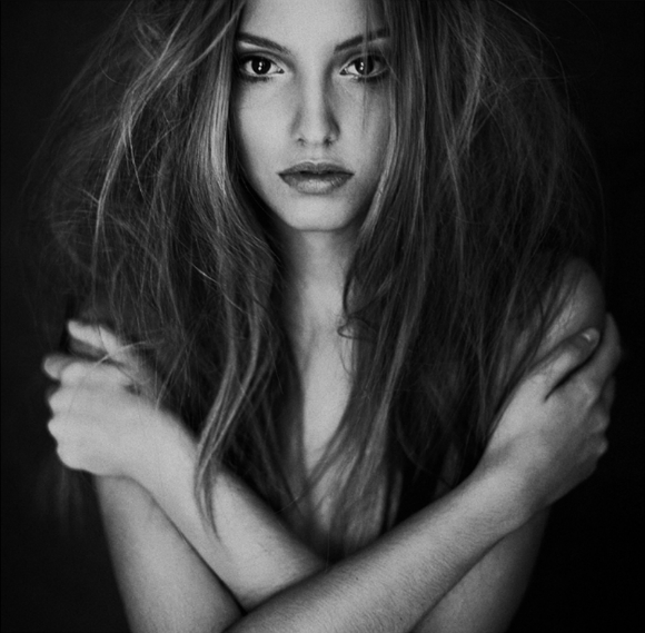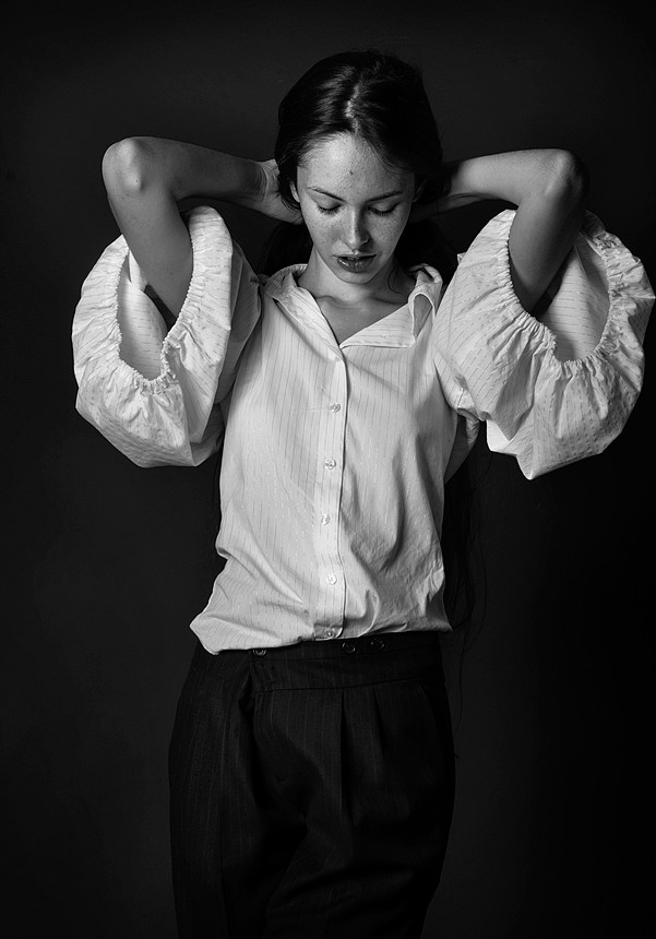 Фон — светлый, свет — моноблоки с зонтами. Источник, расположенный слева от фотографа — основной. Он заполняет области лёгким, рисующим светом. Второй заполняет сильно затемнённые участки и делает картинку объёмной. Модель лучше развернуть к фотографу в «три четверти».