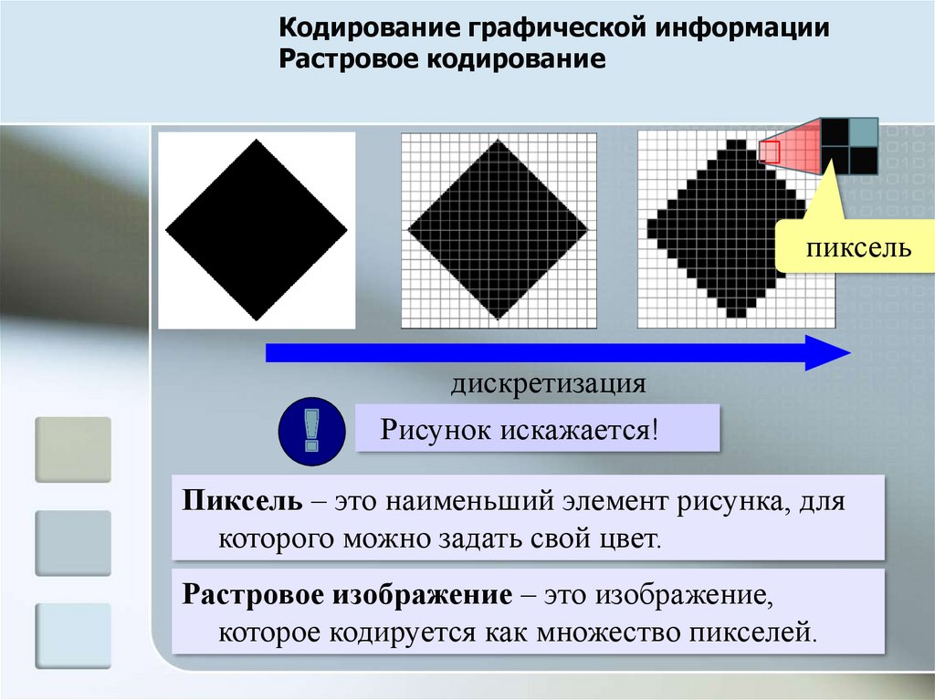 Но логически пиксели всё равно представляют в виде квадратов. Так проще и понятнее.