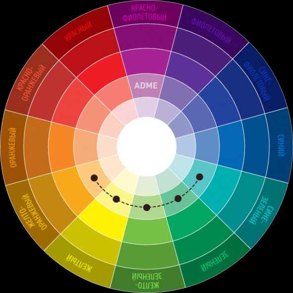Внешний круг схемы — это палитра в виде спектра. Тона, которые можно увидеть на ней, получаются в результате смешивания главных и второстепенных цветов.