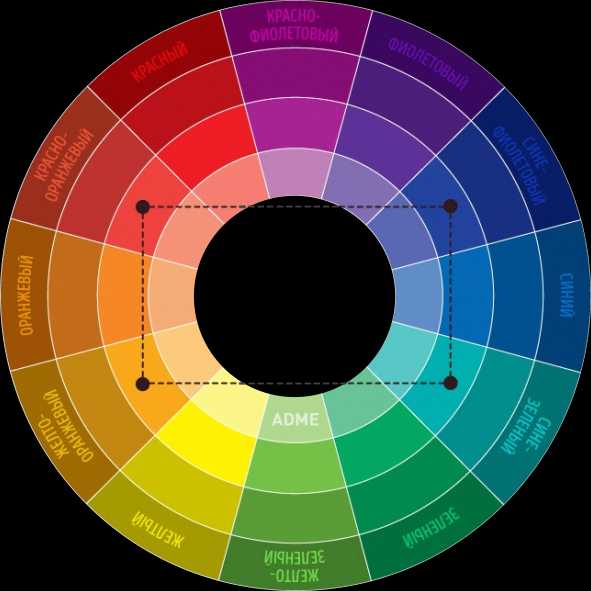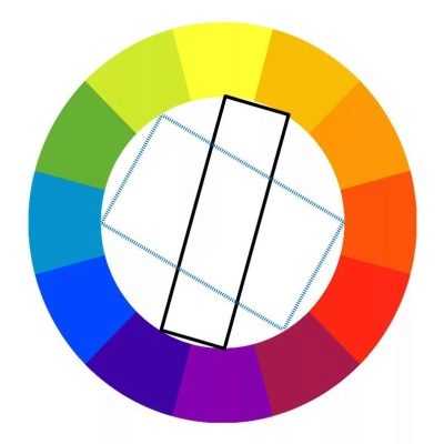 Чтобы создать большую комбинацию, используют прямоугольник или ромб, которые помещают в круг Иттена. Углы фигур указывают на оттенки, хорошо сочетающиеся между собой.