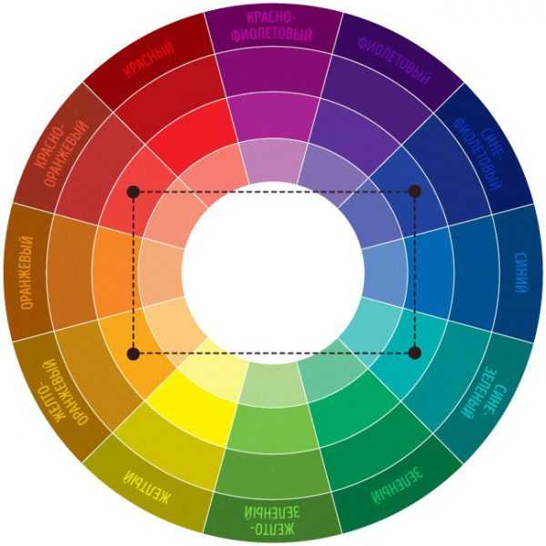 Сочетание 4 цветов, равноудаленных друг от друга на цветовом круге. Эти цвета отличаются друг от друга по тону, но также дополняют друг друга. Пример: фиолетовый, оранжево-красный, желтый, сине-зеленый.