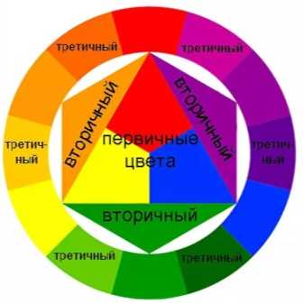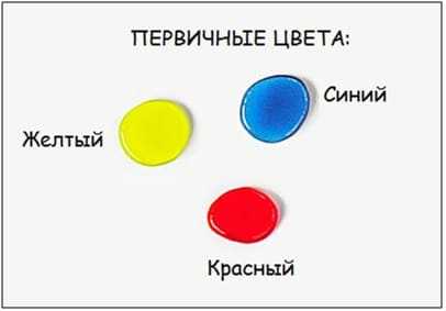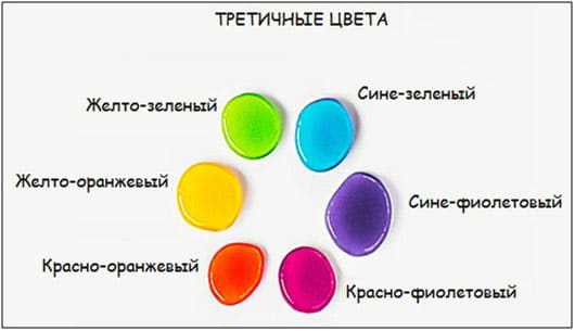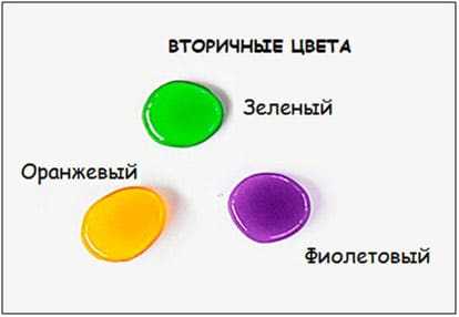 Красный, синий и желтый являются основными цветами. Когда смешивается красный и желтый, получается оранжевый; смешать синий и желтый, получится зеленый цвет; при смешивании красного и синего, получится фиолетовый. Оранжевый, зеленый и фиолетовый являются вторичными цветами. Третичные цвета, как красно-фиолетовый и сине-фиолетовый получаются путем смешивания основных цветов с вторичным цветом.