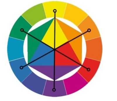 Обычно такую схему применяют только опытные дизайнеры, поскольку она считается самой сложной. В цветовой круг тут вписывают шестиугольник, и базой становятся три пары дополнительных цветов.