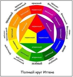 Сочетание цветов происходит по определенным правилам. Художник И. Иттен создал определенные схемы цветов, которые более всего подходят друг другу. Он поместил все цвета в круг в таком порядке, чтобы они разделялись по степени первичности и взаимодействовали друг с другом.