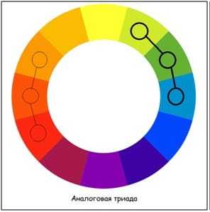 Аналоговая триада: сочетание от 2 до 5 (в идеале от 2 до 3) цветов, находящихся рядом друг с другом на цветовом круге. Примером могут служить сочетания приглушенных цветов: желто-оранжевый, желтый, желто-зеленый, зеленый, сине-зеленый.