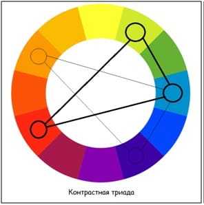 Модель цветовой триады (мягкий контраст). Основной цвет дополнен двумя цветами, помещенными тождественно по обе стороны его комплемента. В отличие от «острого» контраста, эта цветовая схема зачастую является более комфортной для глаз, она мягче, и в ней больше пространства для балансировки теплых/холодных цветов.Триада образована тремя цветами, равномерно распределяя цветовой круг (120°). Цветовые схемы триады имеют много возможностей по сочетанию цветов, регулировке контраста, акцентов и баланса теплых/холодных цветов.