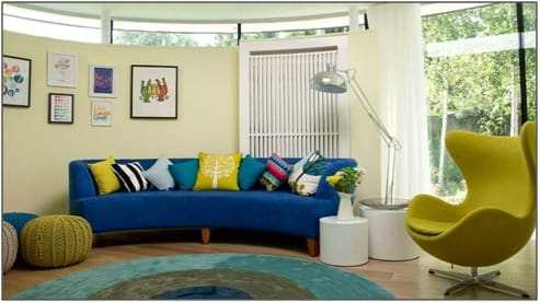 Схема квадрата напоминает прямоугольную, но все тона в ней равноудалены по кругу. Облик комнаты будет живым, динамичным. Примером является включение в интерьер сине-зеленого, желтого, красно-оранжевого, фиолетового.