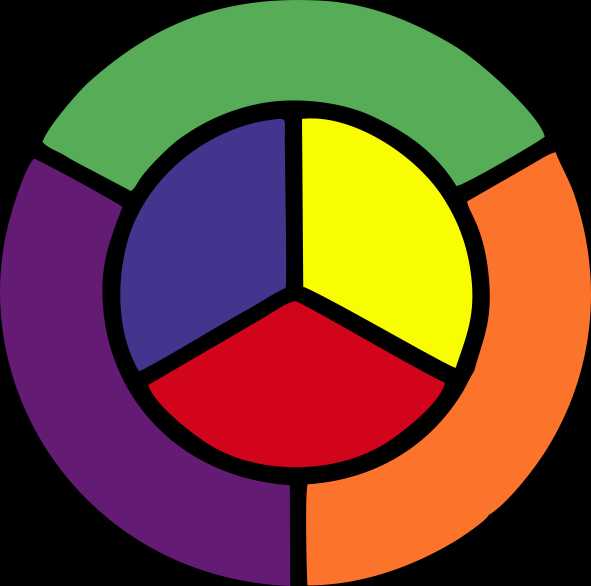 Вторичные цвета — это цвета, которые создаются при смешении двух основных цветов. При смешивании желтого и синего создается зеленый, желтый и красный создает оранжевый, синий и красный создает фиолетовый. Ниже приведен пример цветового круга, с добавленными вторичными цветами на внешнем кольце.