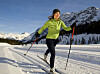 Langlauf: junge Frau Langlauf and einem Wintertag