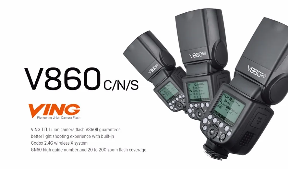 Накамерные вспышки VING V860II TTL с литиево-ионным аккумулятором, со встроенной системой беспроводной синхронизации Godox X 2,4G, с ведущим числом GN60, с углом подсветки от 20 до 200 гарантируют отличные условия освещения для съемки.