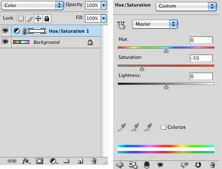 Для начала десатурируем их наполовину. Для того, чтобы яркостное восприятие не менялось или менялось незначительно (нам это важно для сравнения), слой Hue/Saturation положим в режиме Color.