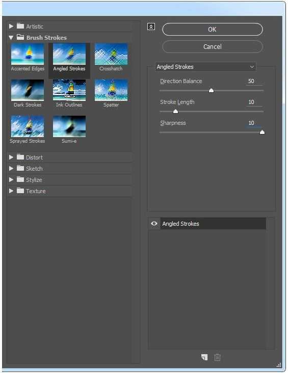 Переходим Filter – BrushStrokes – AngledStrokes (Фильтр – Штрихи – Наклонные штрихи) и применяем следующие настройки:
