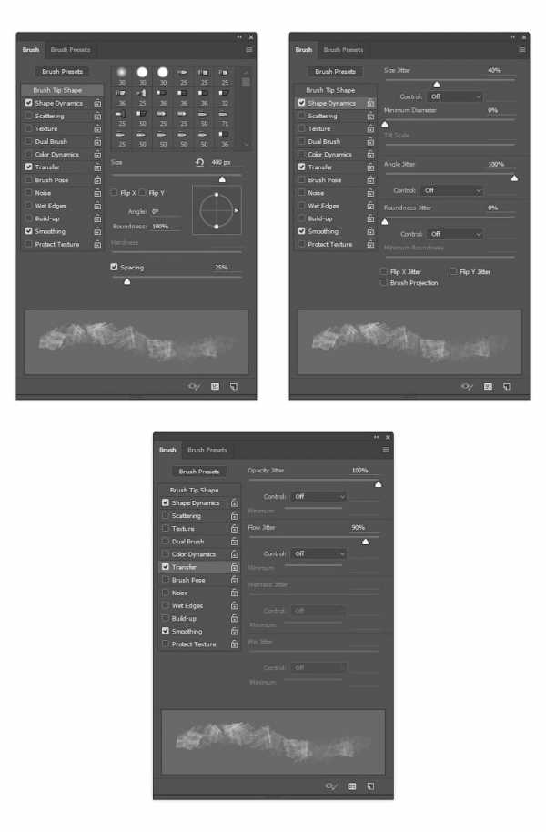 Жмем клавишу В, кликаем правой кнопкой мыши в любом месте рабочего полотна, в открывшемся меню находим кисть «Временная кисть 3» и выбираем ее. Затем переходим Window – Brush (Окно – Кисть) и вводим следующие настройки: