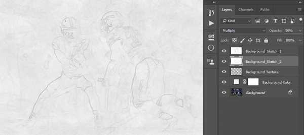Меняем режим смешивания слоя на Multiply (Умножение), уменьшаем непрозрачность до 50% и называем слой «Фоновый набросок 2».