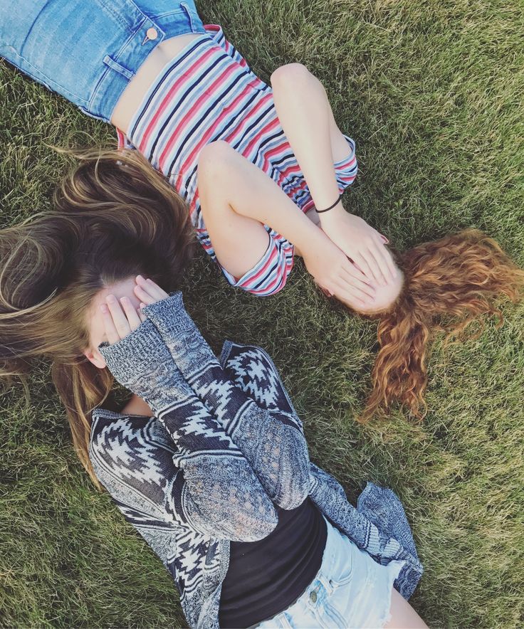 | Можно начать с создания . В теплое время года можно прилечь на травку в таком интересном положении. Можно сделать задумчивый вид, или пошушукаться, как на данной фотографии. | Используя маленькую , сделайте такой портрет, чтобы одна подруга была в резкости, а вторая размытая. | Одна подруга закрывает другой глаза, типа: «Отгадай кто это»! |