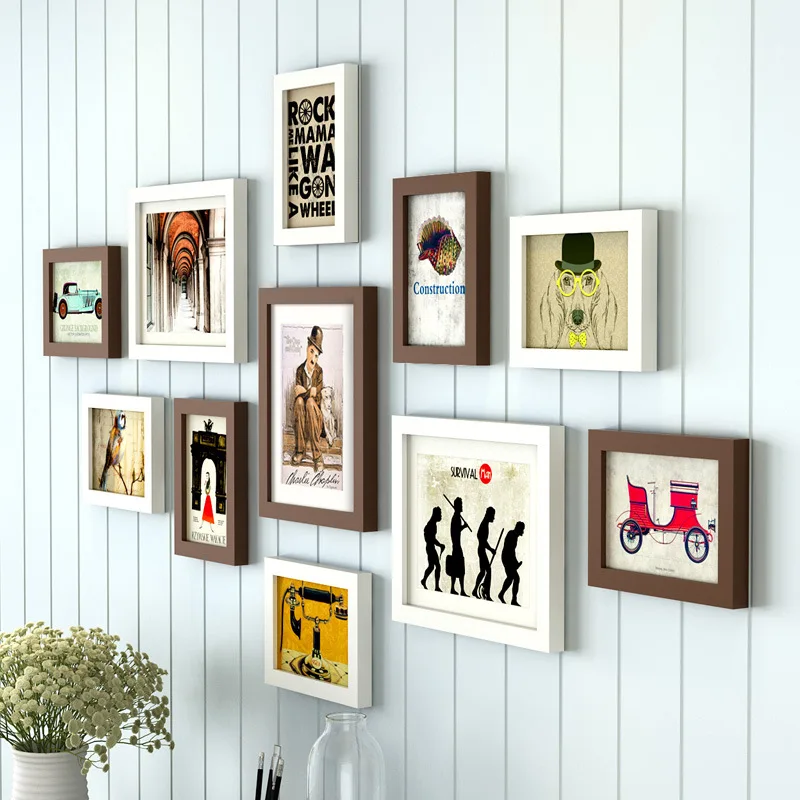 В пределах одной композиции допускается использование фоторамок разных размеров и ширины, но комбинировать разные материалы и фактуры лучше не стоит.