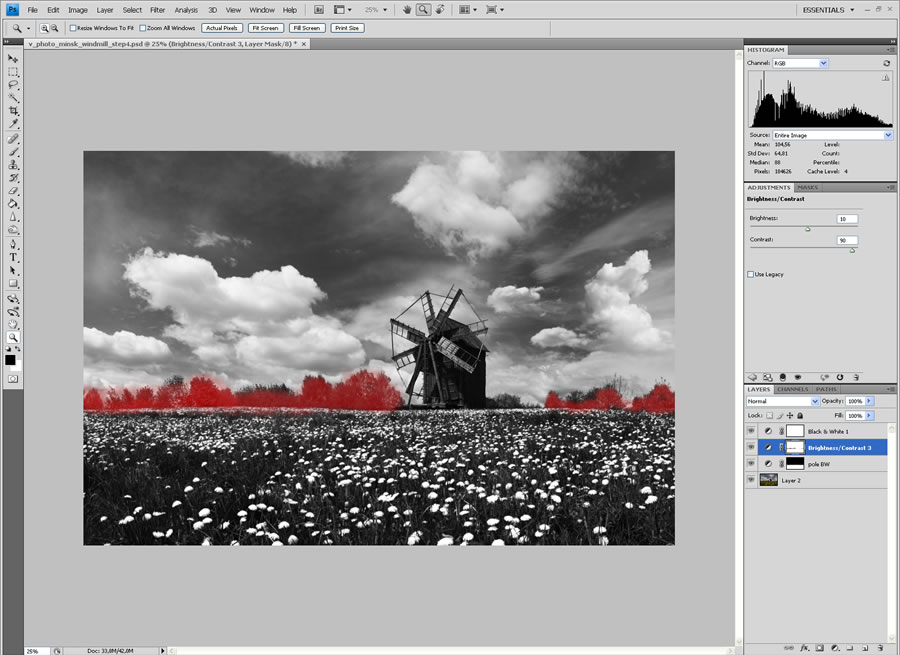Рассмотрим действия поэтапно. Сначало нужно обесцветить изображение. Сделать это можно разными путями, но я обычно использую инструмент «Channel Mixer» («Смешение каналов«). Он дает большую свободу, а при смешении можно сделать акцент на том или ином цвете, добавить немного яркости или наоборот сделать изображение темнее.