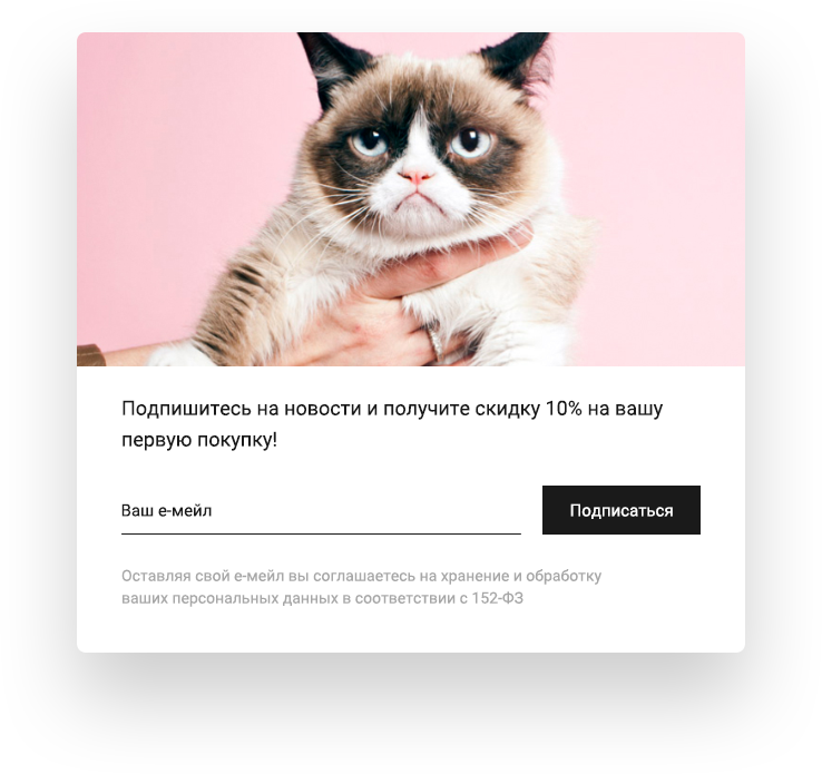 Чтобы подписаться с помощью виджета, пользователь должен нажать на определенное место в интерфейсе сайта — кнопку или картинку, открыв форму подписки. Использование виджета — один из самых эффективных способов привлечь внимание пользователя и мотивировать его на подписку, предложив подарок или специальную скидку на первую покупку: