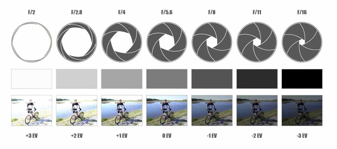 Количество света, которое попадает в камеру, регулируемое размером диафрагмы, исчисляется f-числами. F-числа имеют стандартные значения, такие как F2, F2.8, F4, F5.6 и F8. Чем больше f-число, тем более закрытой будет диафрагма, и тем меньше света пройдет через объектив. Чем меньше f-число, тем более открытой будет диафрагма, и тем больше света пройдет через объектив.
