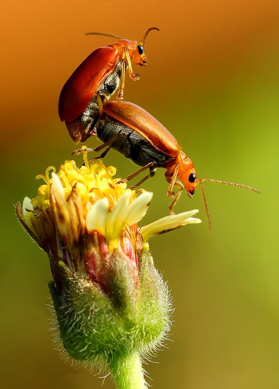 Спустя некоторое время я стал задумываться о том, чтобы добавить в описанную выше схему телеконвертер для получения максимально возможного увеличения насекомых. Хотя я предполагал потери в качестве и светосиле, все же удалось получить неплохие результаты. Во-первых, я смог заглянуть в таинственный и полный неожиданностей микромир, который невидим человеческим глазом, и получить крупные портреты насекомых размером не более 3 мм. Во-вторых, это навело на мысль сделать кадр с большим фокусным расстоянием, что позволило вместить в кадр диск солнца. Нужно было лишь убрать из схемы макронасадку. Так возникла идея создания кадра «Дирижер заката».