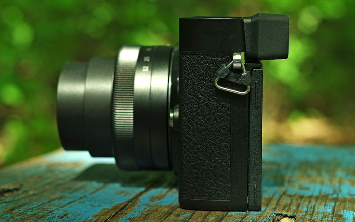 Электронный видоискатель имеет наклонную конструкцию, по ощущениям маленький в максимальном разрешении снимка используется соотношение сторон 4:3, по бокам присутствуют черные неактивные полосы с информационными значками, он очень маленький и может использоваться при крайней необходимости, когда дисплей не читается на ярком солнце. Панель с разъемами Micro USB и Micro HDMI имеет новый дизайн в виде скользящей крышки, которая скользит обратно в корпус камеры для безопасного хранения при открытии. Не хватает гнезда для наушников и внешнего микрофона.