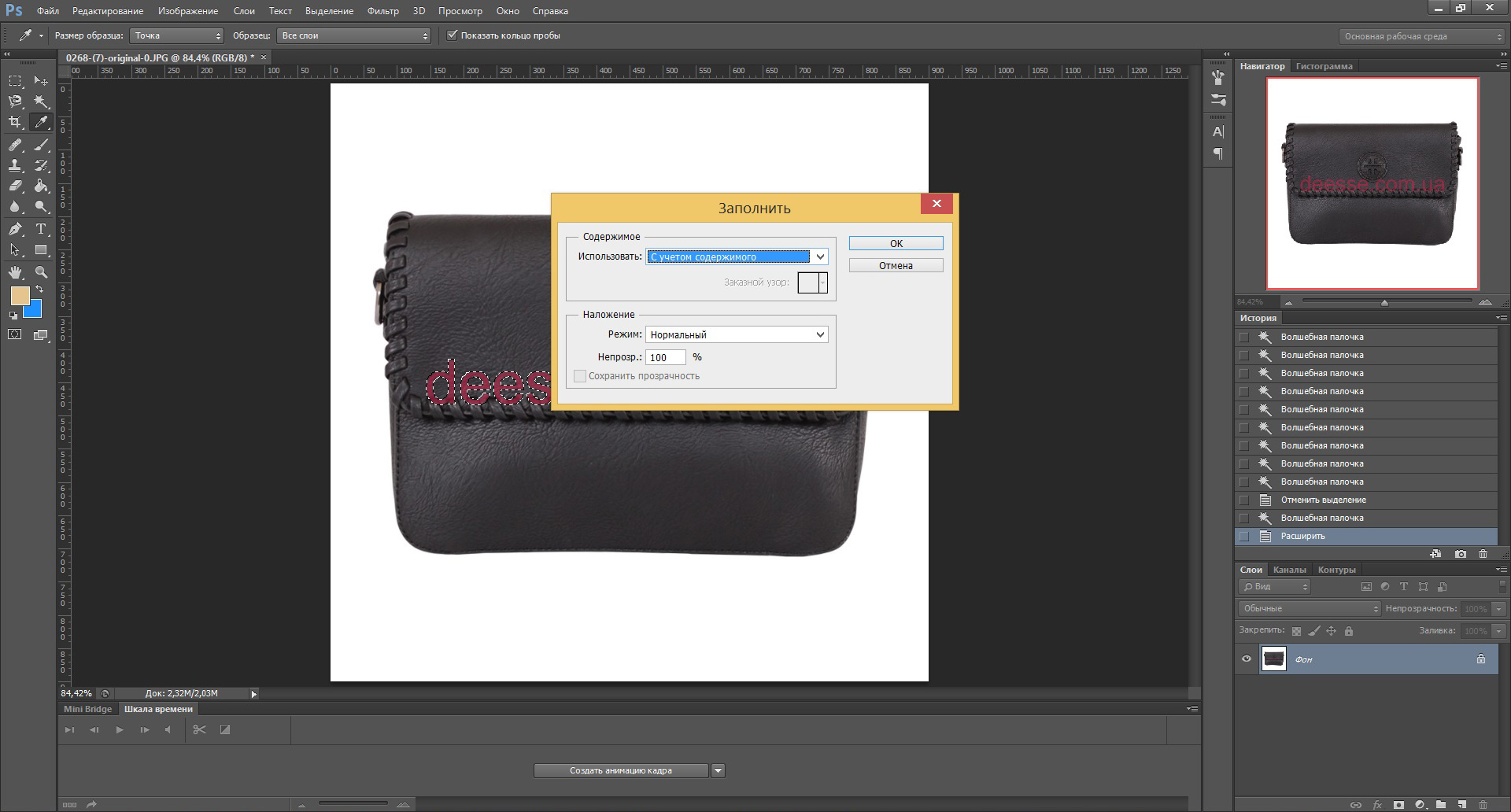 Шаг 4. Перейдите в «Правка»> «Заливка», после чего на экране появится всплывающее окно «Заливка». Здесь вам нужно выбрать «Content-Aware» под списком содержимого и установить «Mode» на «Normal», непрозрачность на «100%» в области Blending. Когда вы закончите настройку, нажмите кнопку «ОК». Тогда вы увидите, что ваш водяной знак исчез на фотографии.