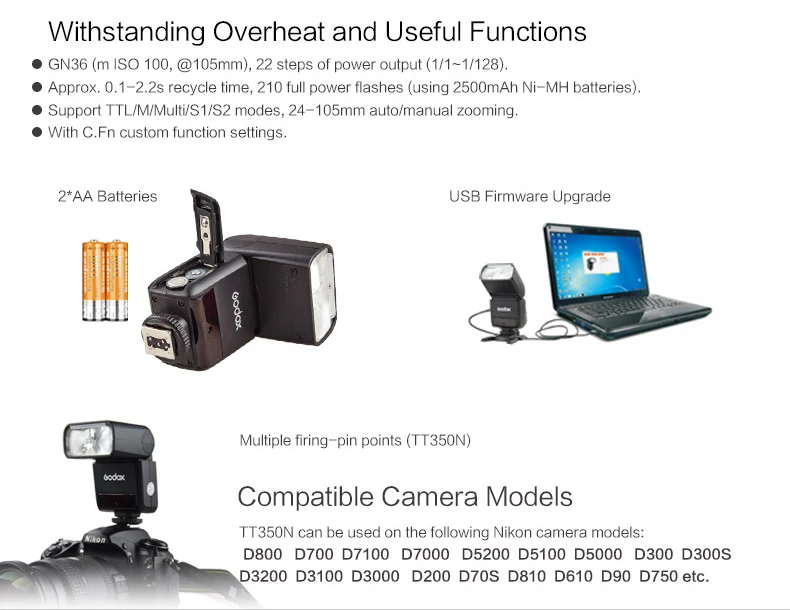 Ving V860IIIS совместимы с системами TTL, что делает их отличным вариантом для камер Sony в качестве единственной или ведущей вспышки, а также ведомой вспышки для использования вне камеры (любого производителя). Существуют также модели вспышки Godox Ving V860IIIN TTL, Godox Ving V860IIIC TTL, Godox Ving V860IIIF совместимые с камерами Nikon/Canon/Fuji и т.д.