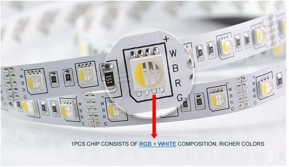 В то время как RGB может воспроизводить цвет, близкий к белому, специальный белый светодиодный чип обеспечивает чистый белый тон, который лучше подходит для рабочего и акцентного освещения, когда цвет не нужен. Дополнительный белый чип также позволяет светодиодной ленте создавать уникальное сочетание RGB и цветного освещения.