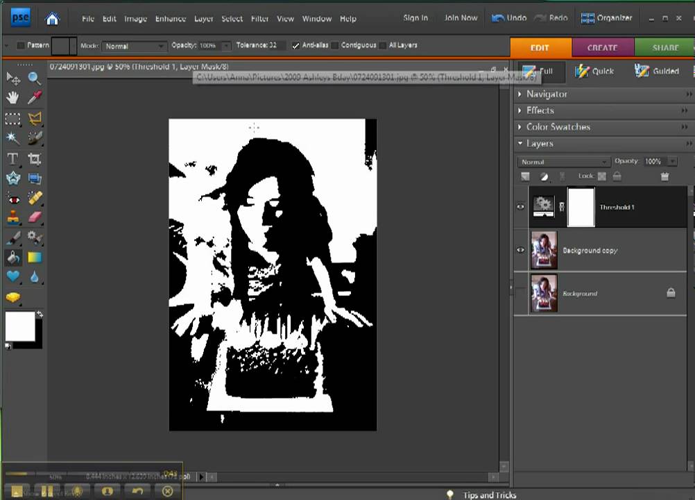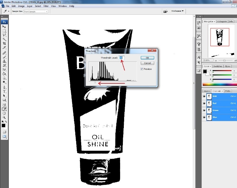 - Чтобы изменить изображение на черно-белое, перетащите ползунок под гистограммой до порогового уровня, который вы хотите появится в верхней части диалогового окна, и нажмите OK. Как ты перетащите, изображение изменится, чтобы отразить новую настройку порога.