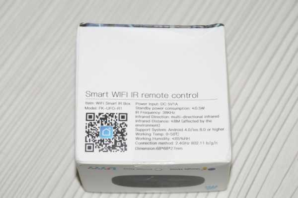 На задней части упаковки характеристики устройства и QR код для скачивания мобильного приложения.