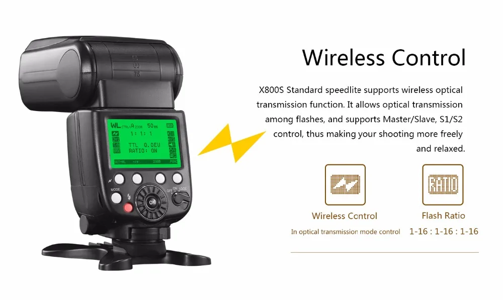 Вспышка поддерживает высокоскоростную синхронизацию с выдержкой до 1/8000, что обеспечивает малую глубину резкости. Встроенная беспроводная передача 2.4G предлагает функции Master и Slave и максимум три управляемых группы. Что касается количества производимого света, то оно равно GN36.